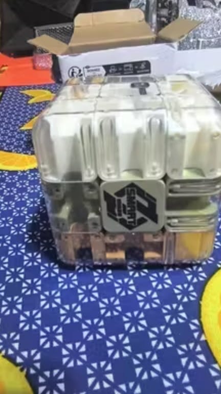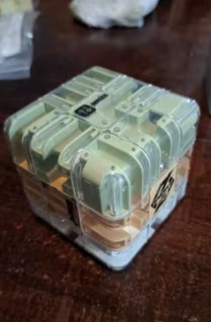 Estructura cúbica de 8x8x8 cm con 6 caras transparentes llenas de laberintos y obstáculos.